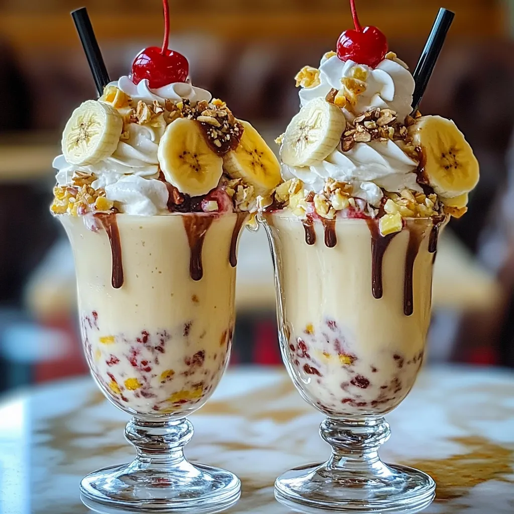 Transform this milkshake into a complete dessert experience by serving alongside crisp waffle cookies or shortbread. For brunch, offer these as a sweet finale alongside fresh fruit and coffee. Create a nostalgic dessert bar with the milkshakes as the centerpiece, surrounded by additional banana split components for guests to customize. During summer gatherings, prepare a batch in a blender and let guests pour their own shakes and select toppings for an interactive dessert experience that everyone will remember.